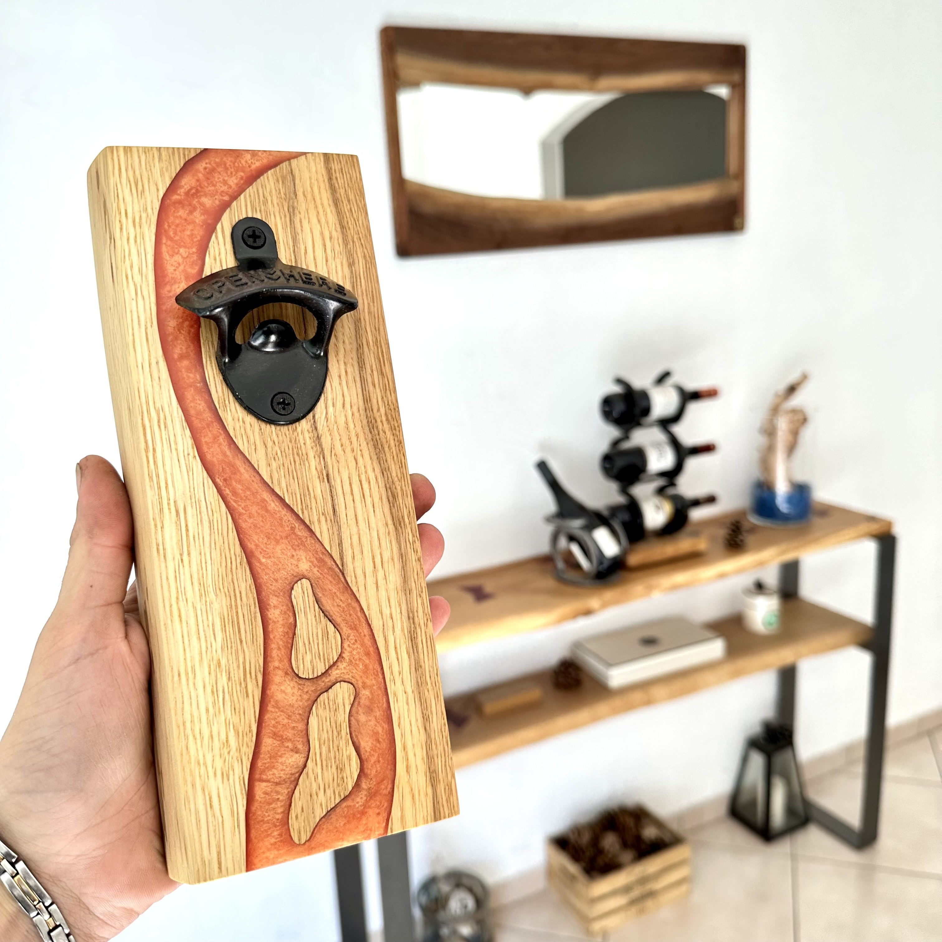 Découvrez notre collection de décapsuleur en bois "Décaps", aimanté sur votre frigo il allie élégance et fonctionnalité. Chaque pièce est fabriquée à la main à partir de bois noble et sublimée par une rivière en résine aux teintes vibrantes, rappelant la nature en mouvement. L’association de matériaux confère à cet objet une esthétique naturelle, idéale pour agrémenter votre intérieur ou offrir un cadeau original et artisanal.