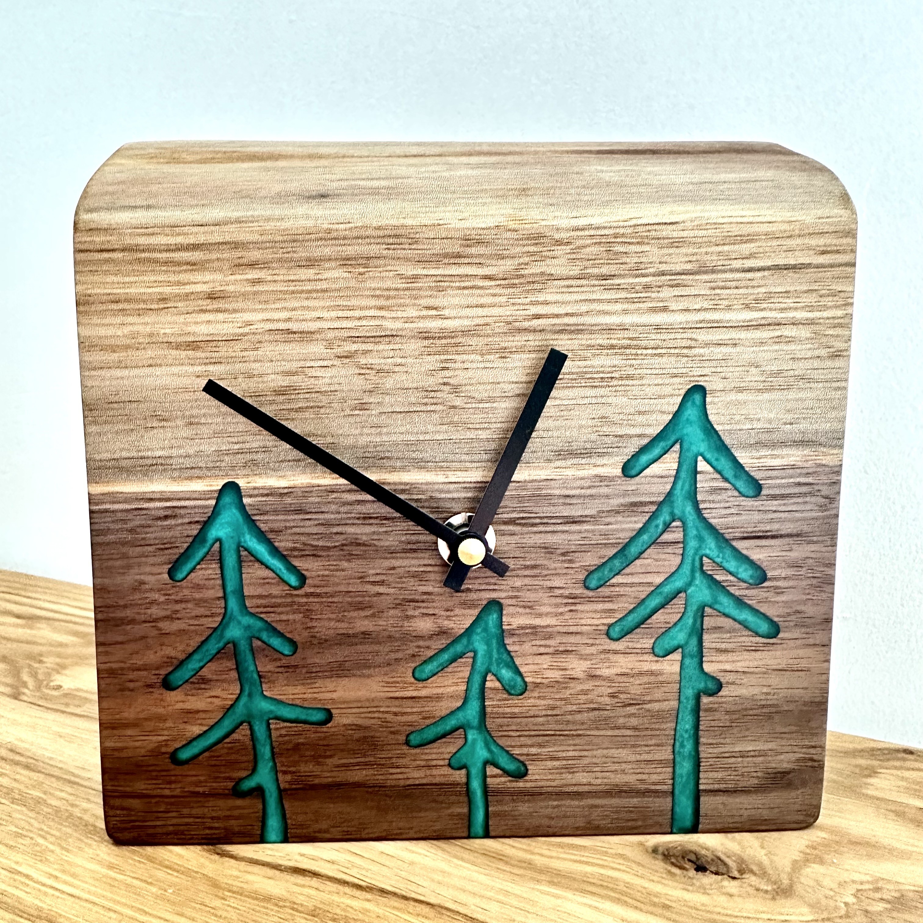 Horloge originale dans une belle pièce de noyer américain live edge, arbres en résine epoxy pigmentée.