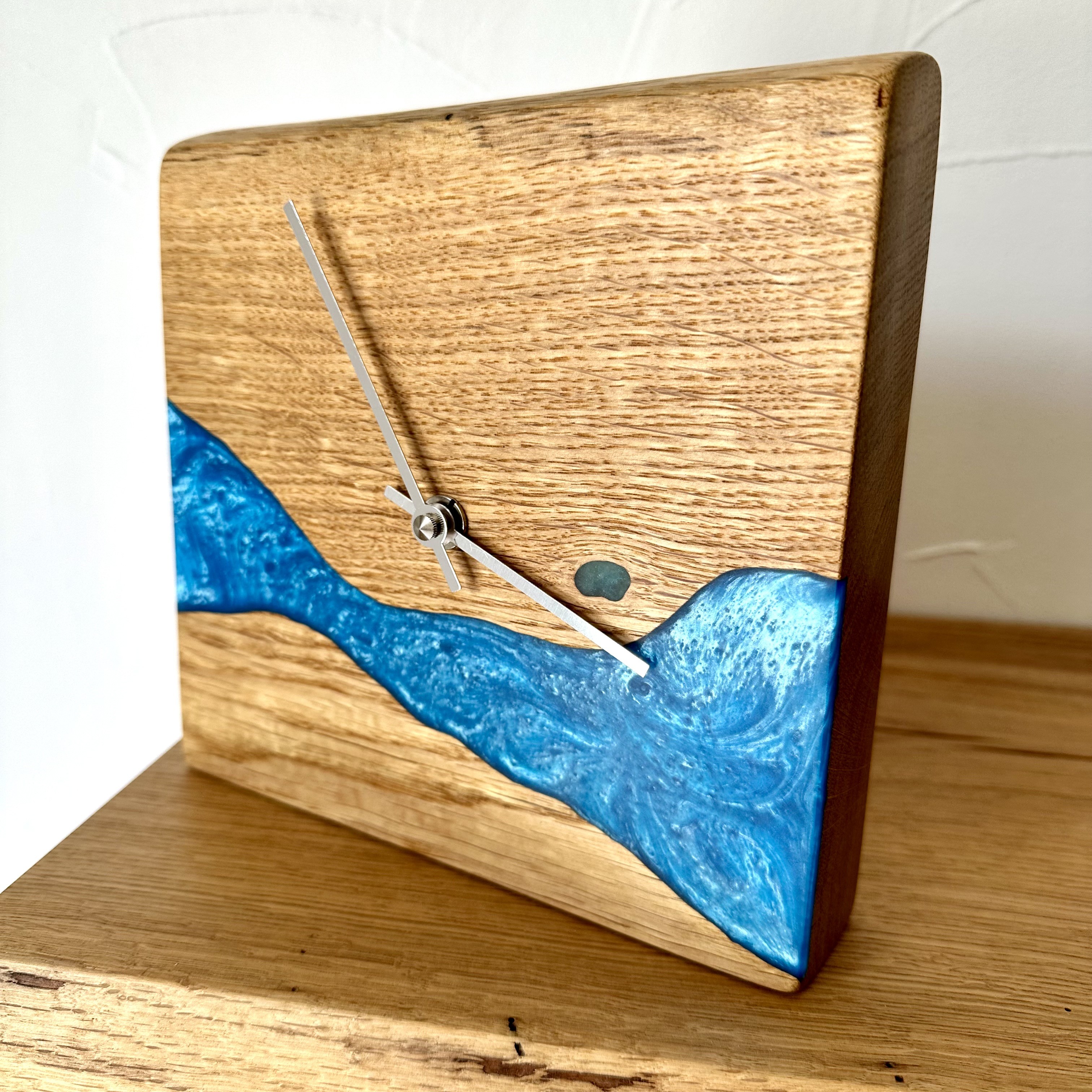 Découvrez notre horloge unique en chêne live edge incrustée d’une rivière en résine époxy. Son design naturel et moderne se marie parfaitement avec n'importe quel décor. Placez-la sur une étagère, une table d'appoint, un bureau ou une table de nuit pour une touche de style instantanée. Cette création exclusive est une véritable pièce maîtresse qui ne manquera pas de faire sensation dans votre intérieur.